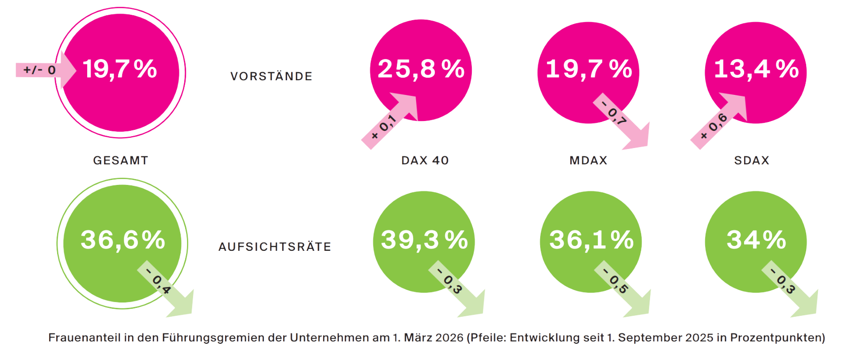Am 1. März 2026 sind die Vorstände der 160 deutschen Börsenunternehmen in DAX, MDAX und SDAX mit 554 Männern und 136 Frauen besetzt. Das sind zwei Frauen weniger als vor sechs Monaten und entspricht einem Anteil von 19,7 Prozent. Seit 1. September 2025 waren nur 15 Prozent aller Neubesetzungen Frauen – vor 3 Jahren (1. Sept. – 1. März 2022/2023) waren es noch 48 Prozent. Bleibt es bei diesem geringen Frauenanteil bei den Neurekrutierungen, wird der Frauenanteil in den Vorständen schon sehr bald sinken.